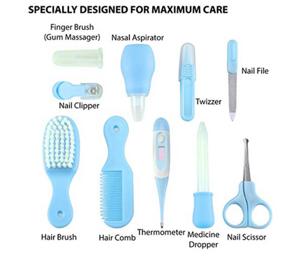 This baby nursery kit includes assorted 10 pieces healthcare tools for your delicate baby. It includes: nail clipper, nail file, scissor, tweezer, nasal aspirator, dropper...